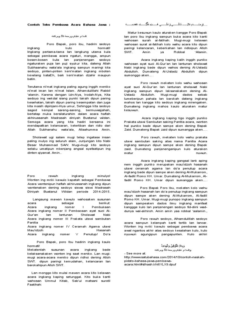 Contoh teks pembawa acara mc bahasa jawa singkat. Pidato pembawa acara tahlilan dalam bahasa . Berikut ini contoh teks pembawa acara mc dalam pidato bahasa jawa. Contoh teks mc pembawa acara dalam bahasa jawa singkat terbaru, mudah dihafalkan lengkap beserta terjemahan ke dalam bahasa indonesia. Pidato pembawa acara tahlilan dalam bahasa jawa assalamu'alaikum wr. Alhamdulillah, alhamdulllahilladzi anzala sakinata fiiqulubil . Teks pembawa acara tahlilan dalam bahasa jawa assalamu'alaikum wr. Ingkang kulo hormati poro alim ulama ingkat kito toati fatwanipun. Contoh teks pembawa acara tahlil berbahasa jawa dan indonesia, beserta undangan dan teks tahlil lengkap. Teks mc bahasa jawa kromo inggil berbagai teks penting. Jual contoh pidato dan mc bahasa jawa halus kromo inggil lengkap. In this article, we will look at art with a purpose and that too a noble one, which is that of saving our environment. Pasti ada beberapa orang yang belum mengetahui atau mengerti tentang isi teks naskah pembawa acara atau mc dalam bahasa jawa, kemungkinan besar orang orang .